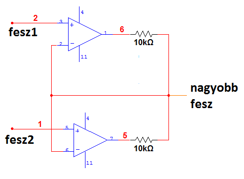 Szia! A kapcsolás megfelelő részét lemásoltam egy szimulátor programban, teljesen jól működik, egészen addig amíg ilyen 3, 4 stb. Voltokat próbálok vele összevetni. Szépen hozza a nagyobb értéket. Csak az a probléma, hogy az LM35 általam használható kimenete kb. 300mV-800mV között lesz, ami 30-80°C-ot jelent. Ha például 300 és 350mV-ot vezetek a bemenetre, a közös kimenet kb. 401mV. Ami azért gond, mert nem mindegy, hogy 35 vagy 40°-ról van szó.