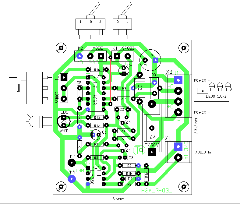 A K2 MODE kapcsolóval, ki-be lehet kapcsolni a Led-eket, vagy középállásban villog. (Ha nem kell ilyen üzemmód elhagyható.) A K1 kapcsolóval lehet váltani, hogy zenére villogjon, vagy "strobiként üzemeljen". üdv! A hozzászólás módosítva: Szept 3, 2013