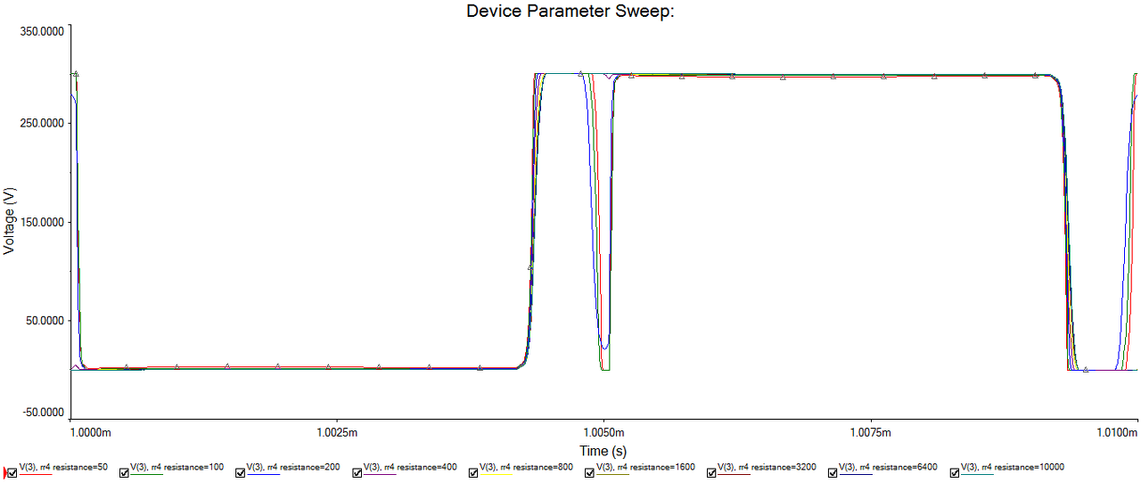 )A kapcsolás az változatlan (100kHz -re belőtt rezonáns kör, 1mH mágnesező indukvitiás, lásd Üresjárat.png). De 600ns holtidőt használtam! Na most mivel a rezonáns kör ezen számításai pont elahnyagolják a holtidőt, ezért célsezerű szimulációval megkapni az eredményt. R4 a terhelés a kapcsolásban, aminek értékét pörgessük, miközben rajzoljuk ki a félhíd feszültség (ezen látjuk, ha kiürül a meddőáram, emg azt is ha keménykapcsolás lesz). Erre a Multisim Parameter Sweep analyzise alkalmas. Az eredmény az 1mH_magnesezo.png-n jól látható. Bizonyos terhelési tarotmányban a meddőáram kiürül, és keménykapcsolás van (ez kb 2W plusz disszipációt jelent FETenként). A vezetési veszteség IRF840 FETek esetén kb 2W (kb 300W terhelésnél, FETenként), IRF740 FETesetén az 1-1,5W lesz. Most merült fel bennem, hogy mi történik ha csökkentjük amágnesező indukvititást? Az biztos,hogy a meddőáram nő, azonban a meddőáram változási sebessége is nő, így nekem az a becslésem támadt, hogy nem lesz változás. Tévedtem! Lásd 500uH_magnesezo.png Itt már csak a legnagyobb terhelés esetén fordul elő keménykapcsolás. Ha 300uH-re csökkentjük a mágnesező indukvitiást, akkor a keménykapcsolás teljesen megszűnik. Korábban azt mondtam neked, hogy a plusz meddőáram miatt a diódák vezetése melegít. Ha 300uH-ra csökkentjük a mágnesező indukvitiást, akkor 2A lesz a meddőáram csúcsa (olyan 250W terhelés esetén), amelnyek effektív értéke 0,06A lesz (600ns / 5us és háromszög alakú) ez kb 0,1W-ot jelent FETenként, vagyis a melegedés főbb inkább a keménykapcsolás (a meddőáram irányának megváltozása miatt). Vagyis, ha a trafódba beleraksz egy pici légrést, akkor javulni fog a helyzet!