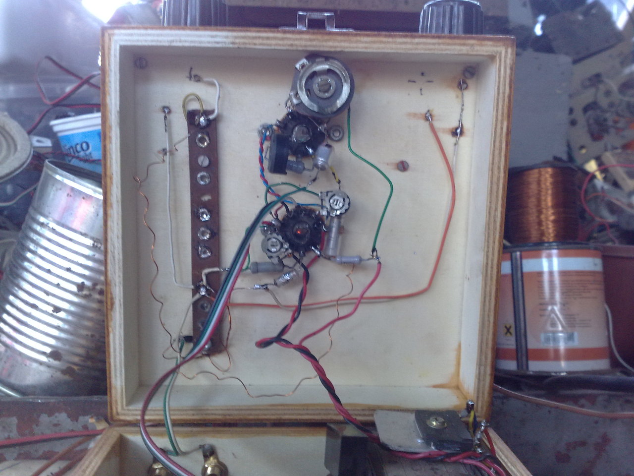 Csövekkel azért sokkal nagyobb munka. Állítom, hogy semmivel nem tudnak többet. Nemhiába mentek ki a divatból. Sütnek, ráznak, és nagyon sokat kell fúrkálni a foglalatoknak. Bár össze tudnám dobni azt is ilyen légszereléssel, mit amit a képen láttok. Először is betettem a FET-et a detektorosom elé. Az éjjel ki is próbáltam pozitív visszacsatolással. A távoli adókat a + vcs. gerjedési határon tartásával be lehet egerészni. Reggel elkezdett adni a Kossuth. Az annyira üvöltött rajta, pedig már hangerő potenciométer is volt benne, egy 1 Megohmos, de torzított, akárhova halkítottam. hogy le kellett szedegetnem róla az antennát és a földet. Képzeljétek a Kossuth még ferrit antennával is üvölt. Kikötöttem a visszacsatolást, akkor nem lett torz a hangja. Így viszont, ha már csak az az egy adó hallgatható rajta, kidobtam belőle a forgókondit, hogy megmutathassam, milyen kicsi lett. Az a kis hangszóró a képen csak szemléltetésnek van, igazán szépen ettől nagyobb, lehetőleg dobozos kell rá, és telepes üzemhez nem ez a darlington, hanem egy IC-s végfok, akkor nem fogyasztana ennyit, mint így "A" osztályban, de tápegységről persze már így is jó. Talán egy TDA2822, vagy hasonló végfokkal telepről is gazdaságos rádiót lehet összehozni ezzel az 1 FET-es előfokkal. A FET nem akart igazán audionként működni, kellett a dióda utána, úgy sokkal hangosabb, mint az nélkül, azt a filléres diódát nincs miért sajnálni belőle, a csöves korszak legelején, azt hiszem még ilyen tűs diódák sem voltak, pedig ez az az alkatrész, ami igazán marékszámra van a fiókban. A FET előfok a rezgőkört nem terheli, és ezért ideális nagyfrekvenciás előfoknak. Nem a tizedére leosztott jel vezérli, mint a tranzisztorokat, éppen ezért ebben a kapcsolásban hatalmasat erősít. Ez a rádió biztosan nem gyengébb, mint a csöves elődjei. Csupán a pozitív visszacsatolás folytonos tekerészése állomáskereséskor, és az AGC hiánya miatt teljes hangerővel üvöltő román adók miatt ez a fajta egyenes vevő nem versenyképes a szuperekkel, bár építettem hajdanában egyenes vevőket AGC-vel, azok olyanoknak, akik főleg csak Kossuthtot hallgatták, már egész jól használhatóak voltak, ma meg már mást szinte nem is lehet nagyon hallgatni a középhullámon. Egyedül ez az, ami kimaradt gyerekkoromból, akkor még nem voltak FET-ek, pedig erre a helyre csak az a legjobb. Széles sávú antenna erősítőt persze nem lehet velük készíteni, mert 75 ohmról ezek nem erősítenek semmit, de ha egy rezgőkör meleg pontjára van kötve a Gate, akkor szinte megtáltosodnak, hihetetlenül nagy kimenő jelet produkálnak. Íme a kép róla: