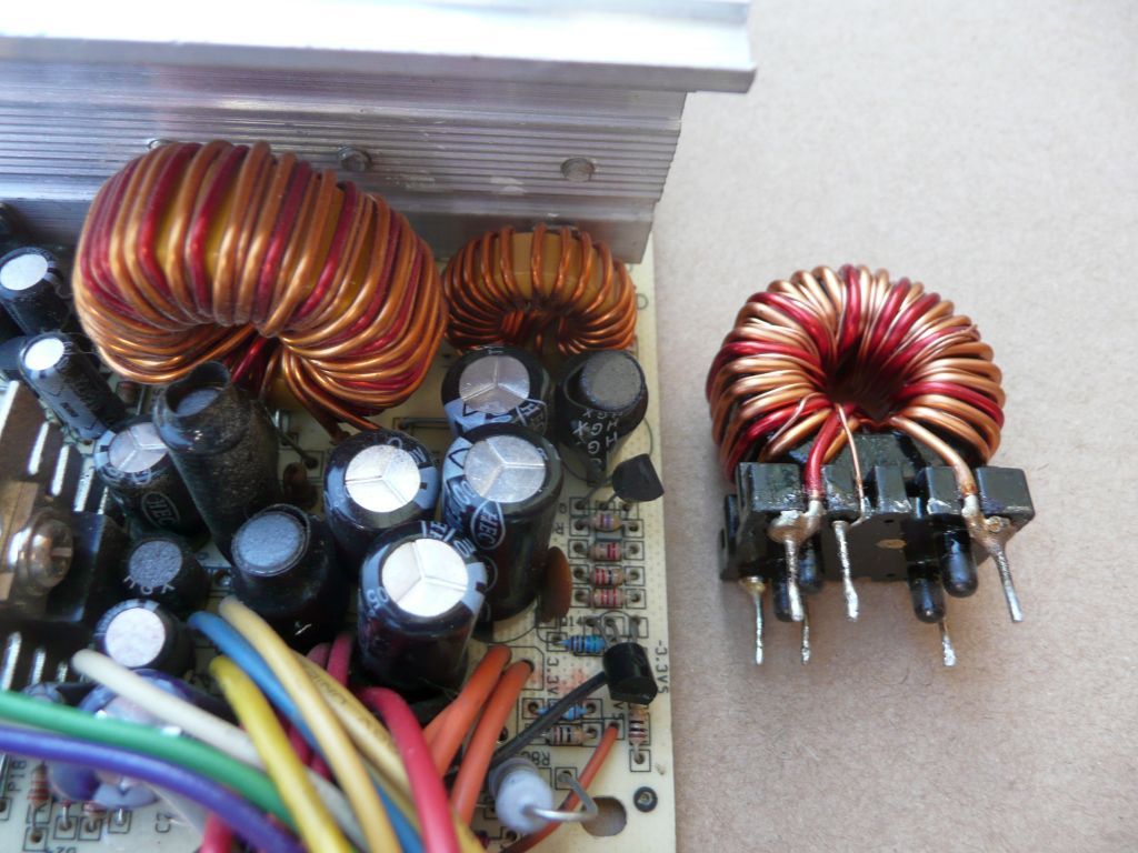 Tehát az áramváltó (vagy kiegyenlítőtekercs) feladata a közös szabályozás miatt fellépő asszimetria kiküszöbölése. Általában a +5V és a +3,3V van átvezetve egy tekercsen (régebbi tápokon a negatív ágak stabilizálását is evvel oldották meg). Az erősen terhelt ág árama növeli az indukciót, amivel változtatja a tekercsen lévő másik ágat is. A mellékelt fotón is látható, hogy ez nem egy közönséges szűrőtekercs.
