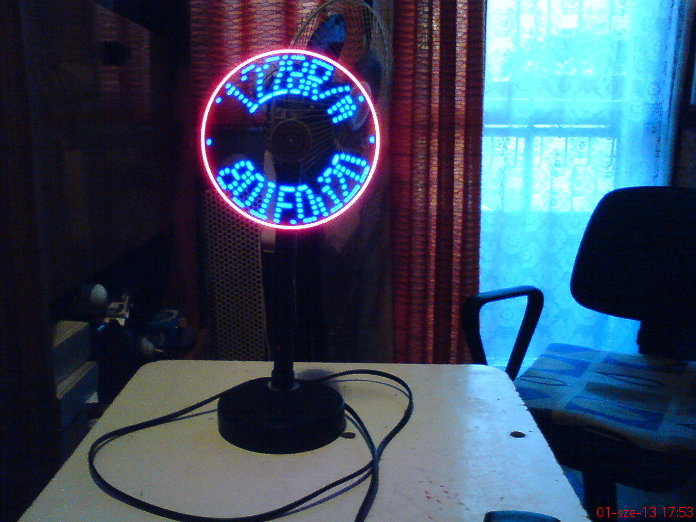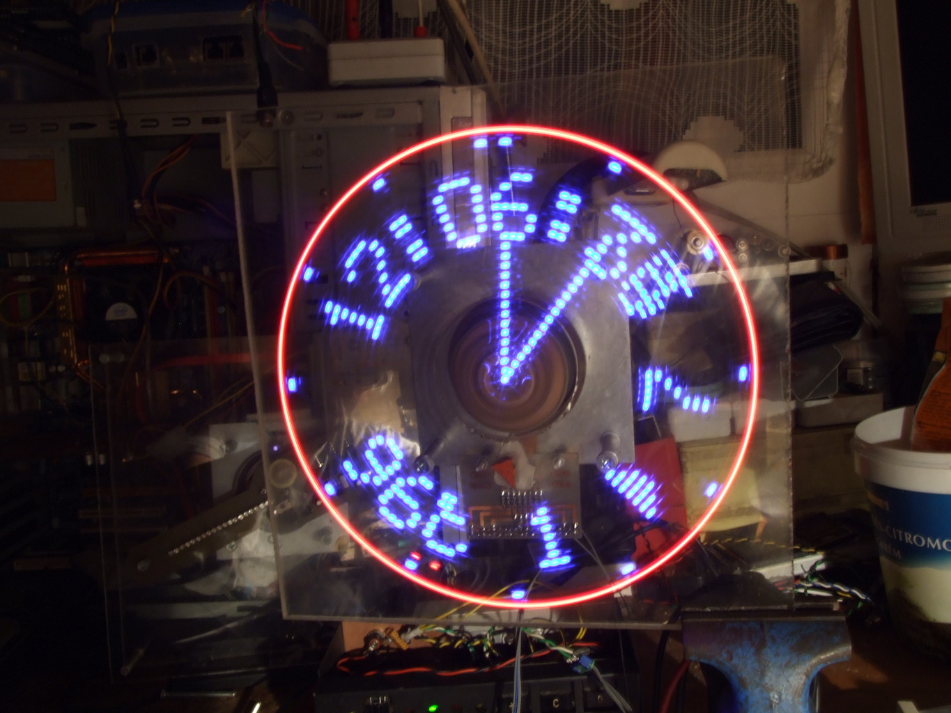 Elkészült az óra.Egyszerű csillár foglalatba bontott CD-rom motorral,de szerintem nagyon pörög.A 2250-es fordulat szükségtelenül nagy és zajos.