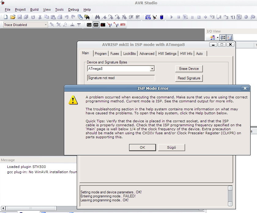 Csak az AVRISP MKII beállítással tudok csatlakozni a programozóhoz. Viszont az avr-t nem tudja olvasni.