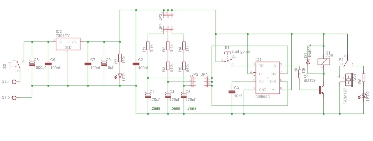Valaki lenne olyan kedves és megnézné ezt a kapcsolást? Kezdőként, magam próbáltam alkotni valamit. A cél egy olyan kapcsolás lenne, ami ha megnyomjuk a gombot elindítja a számlálót. Ezt a 2 jumper állításával lehetne választani, 2-5-7 percre. Az idő letelte után pedig megszólalna egy kis buzzer/csipogó. 5V-ról menne a kapcsolás, amit egy 7805-tel állítok elő.A rajzon lévő relé lábak mostani bekötésével igaz amint áramot kap megszólalna a csipogó, de amint elindítom a számlálót, addig el kellene neki hallgatni és a led2-nek világítani, ami jelzi a kimenetet a3-as lábról, ezáltal a számolást. Ha pedig leveszem a tápfeszültséget, akkor leáll az egész, és a következő bekapcsolásnál az előbb leírtaknak megfelelően lehetne használni.