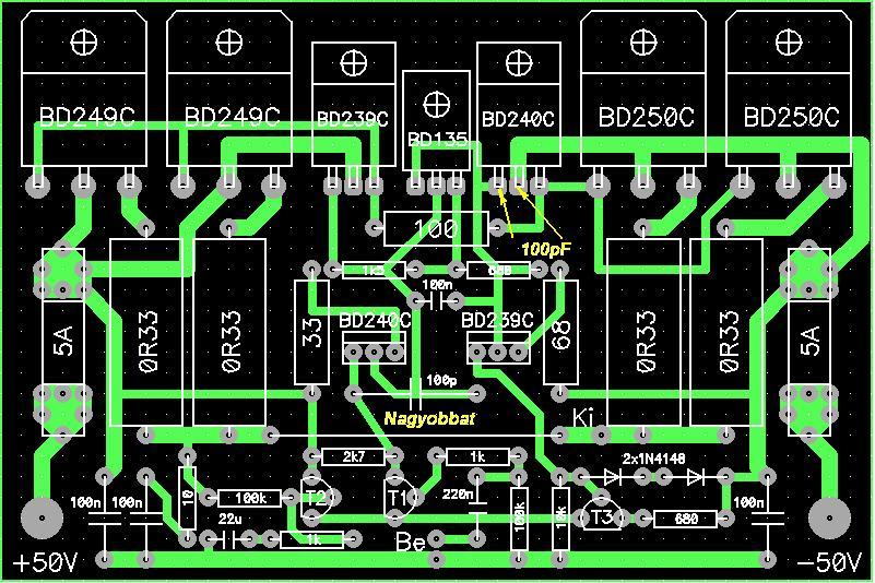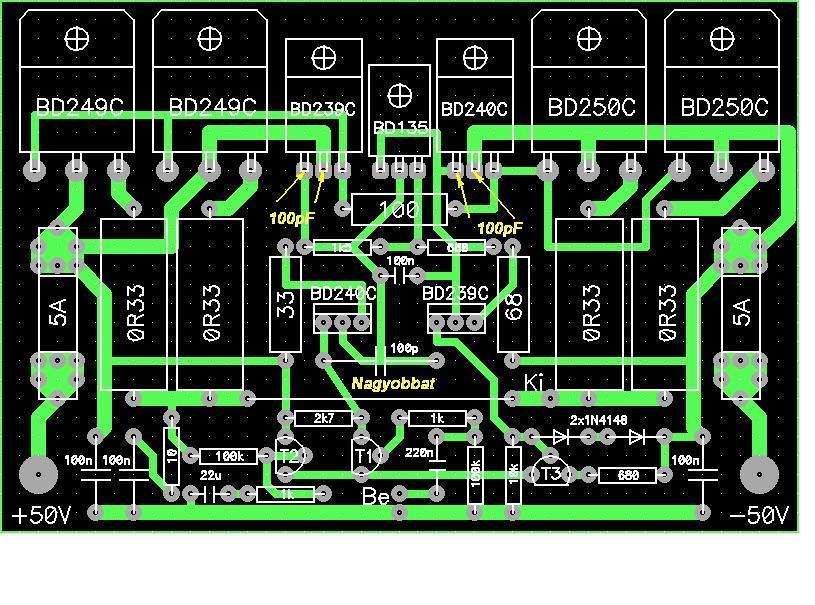![]() A kapacitások értékével valamelyest kísérletezned kell, mert a megtoldott tranzisztor lábak is közrejátszhatnak. Lehet a BD239C-vel jelzett végtranzisztor meghajtónak is kéne bázis-kollektor kondi.