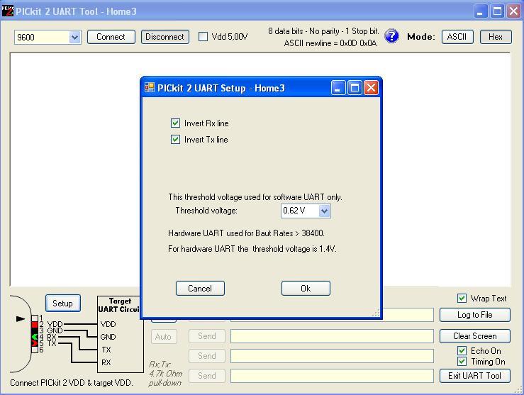 Biztos sokan találkoztak már olyan feladattal, amikor két berendezés közötti RS232 vagy TTL uart kommunikációs adatforgalmat kellett rögzíteni. A PICKit2 erre a feladatra is befogható: A programozott uart kezelés (38400 Baud -ig) és a belső komparátor modul lehetővé teszi, hogy a Tx vonalon venni lehessen a táviratokat...