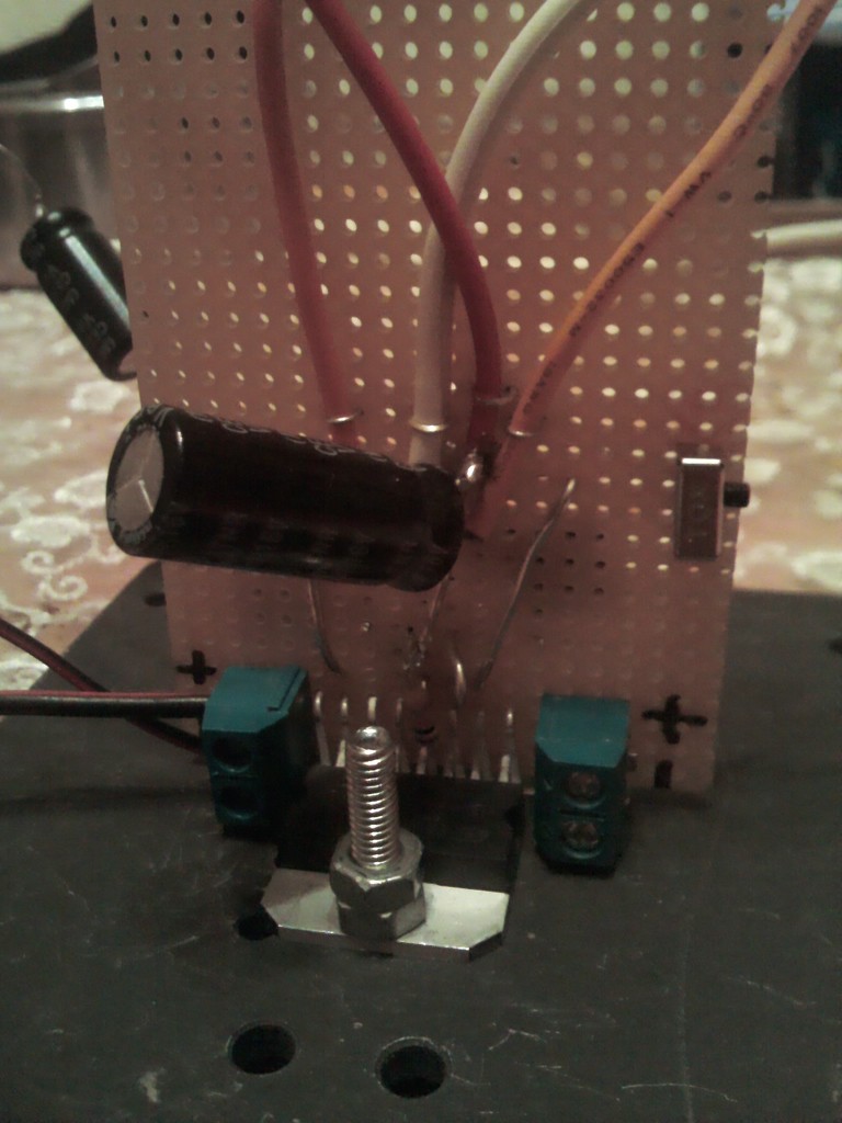 Természetesen a nagy hűtőborda elengedhetetlen, különben az IC magas hőmérséklet miatt áramot fog korlátozni, valamint az LM338T-nek is kell egy kb harmad-negyed akkor borda, mint a TDA7375-nek.