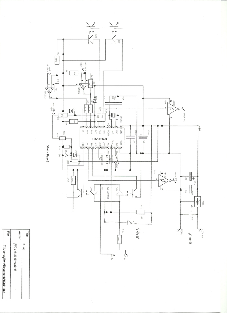 Elsősorban több szem többet lát alapon inkább az esetleges el kötések vagy a nem meglétük érdekelnének, az elgondolás valóban zavaros picit DE a PIC analóg jeleket mér 4 helyen 4 időben viszont digitálisan vezérel 2 optót, az első tölt csökkenő kitöltéssel a második 55W-tal kisüt és az is csökkenő kitöltéssel (ahogy emelkedik az akku feszültsége) majd megszűnik és marad a csepptöltés 0.5A-nál leáll a töltés. 100Hz a 20A-es egyenirányítás után az 1;2; periódus tölt a 3; kisüt a 4; mér. Nagy vonalakban valami ilyesmi lenne az elképzelés, a rajzért elnézés de a TinyCAD nem igen ad sok lehetőséget, vagy még csak ez az első rajzom vele?. Egy analóg töltőt már leégettem 230Ah akkuval pedig az is tudott 24V-on 10A. csak nekem négy darabot kell szulfátmentesítenem mert nincs kedvem cserélni.(alsó hangon 400000Ft) A programozást majd kiizzadom valahogy mint ezt a rajzot. (hobbi szinten űzöm a dolgot és tényleg a Rádiotechnika újság az iskolám) a FET-ek 100V 60A az opto4N35 a táp 300VA toroid.KB ennyi remélem így már érthetőbb az "orosz" rajz. Köszönettel LALA58