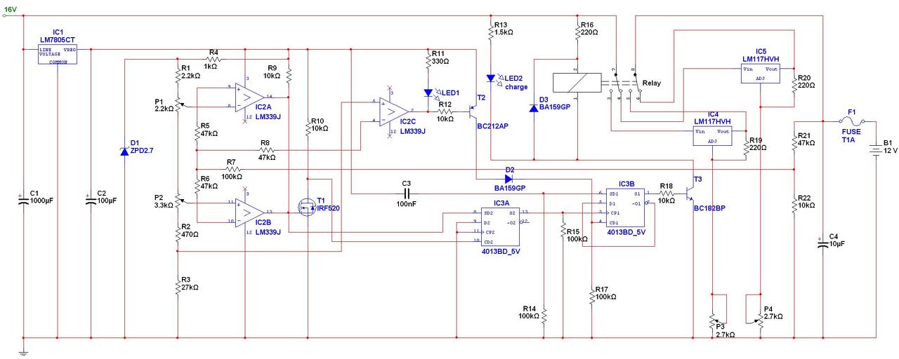 - A D1 zéner felesleges, mert az IC1 által szolgáltatott 5V stabilabb,mint a zéner 2,7V-ja. A 16V és a C1 közé, egy diódát tennék. Minek szűrje a C1 az egész töltésre szánt 16V-ot..