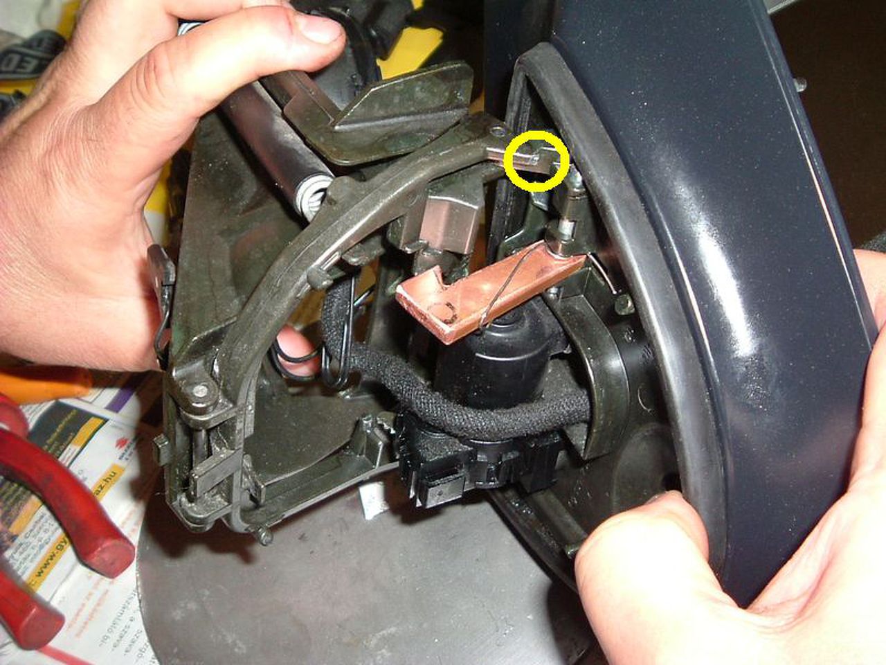 A tükörben található egy motorral felszerelt áttételes behajtó szerkezet, egy rugós végállásra átbillentő szerkezet (azaz a motor csak részben felelős a ki-behajtásért), illetve egy kétirányú végállás kapcsoló (ezek a réz lamellák). Szerintem a probléma vagy a rugós szerkezettel lehet, avagy a réz lamellás végállás kapcsoló lehet elkorrodálva, eltörve. Nem nehéz a szerkezetet szétszedni, érdemes! Keresek képeket is, hátha megvan még amiket annó csináltam róla. Üdv., Balázs