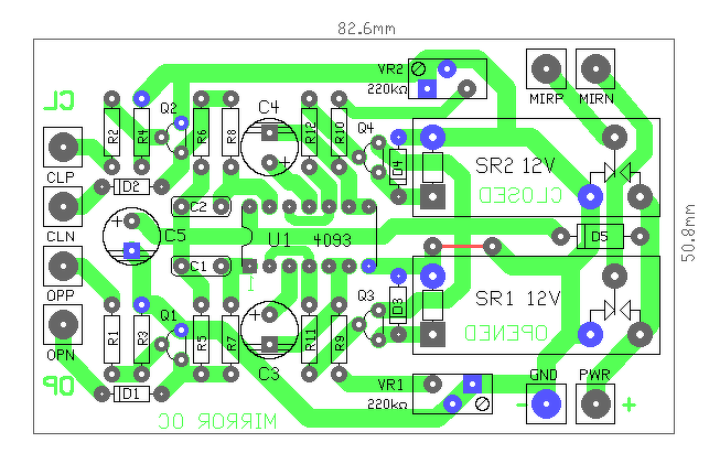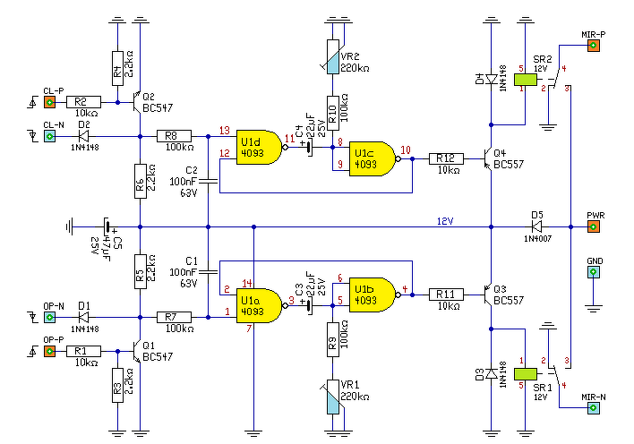 Hello! Oké, itt a rajz. A MIR-P és MIR-N a motor. A PWR a +12V táp, a GND a test. Az OP-P a nyitó pozitív trigger. Az OP-N a nyitó negatív trigger. Stb.. A Vr1-VR2-vel lehet az időzítést beállítani. Ha nem olyan fontos az idő, lehet egy fix ellenállás is.
