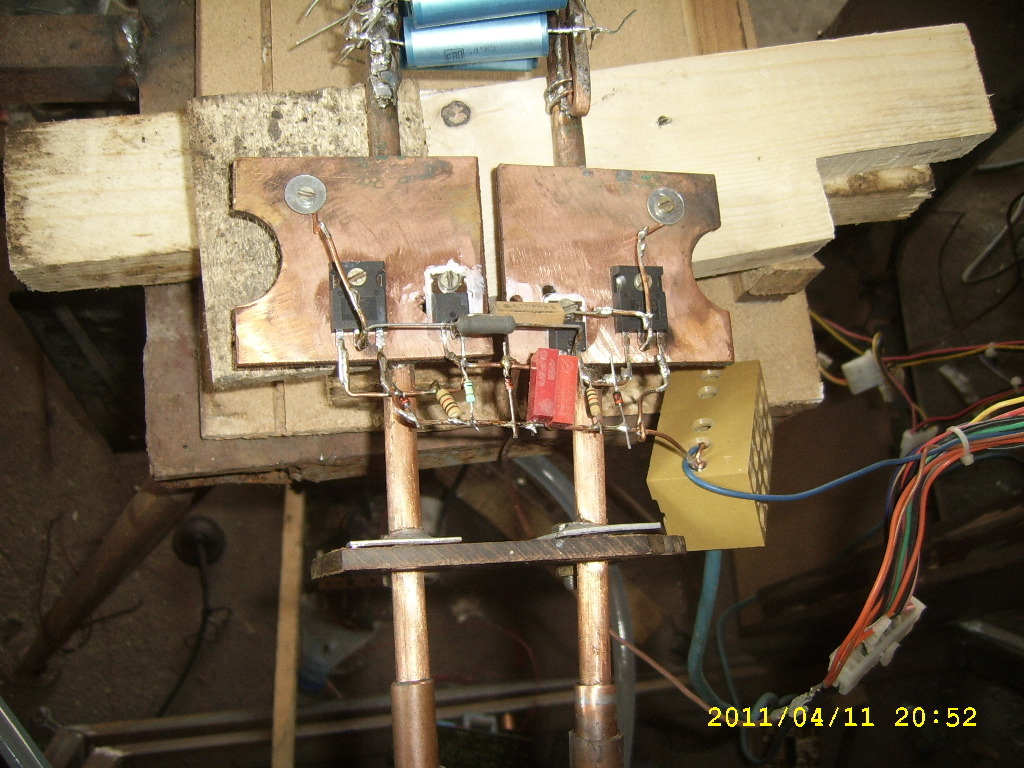 Kondibankal kell ott még játszani picit,nekem 10 µF van összerakva azt hiszem durván 100 db..A 20 mm -es tömött fém rúd kb.20 s alatt hevül fel ,50 V üresjárati fesz.,valamint a vasrudat ha hidegen engedem bele,olyan 20-25 A vesz fel.Ezt ha autogénnel kezded hevíteni sem sokkal gyorsabb,(ha gyorsabb,soha sem mértem) .Oldalanként egy -egy Fettel IRFP 260N.