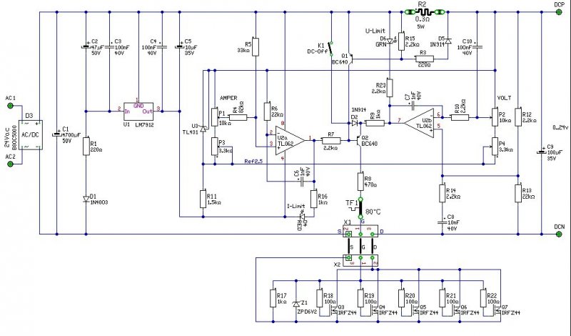 Építettem egy tápegységet próbapanelen. Minden teljesen jó benne, viszont szeretném egy picit kibővíteni, mégpedig egy finomszabályozó feszültség potencióméterrel. A mellékelt rajzban jelöltem is egy 5kOhm-os alkatrész bekötését, kérdésem, hogy így hosszútávon is működőképes-e, mert kipróbáltam így és úgy működik, ahogy szeretném. Másik kérdésem pedig az lenne, hogy hogyan lehetne megoldani, hogy az áramlimit átlépését egy LED jelezze? Az áramkorlátot a P3-mal lehet állítani.