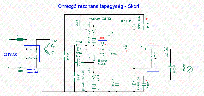 Ez egy önrezgő rezonns tápegység. Az 56nF a rezonáns kondi, ami egyrészt beálltja a rezonáns működést (ezen felül a trafó szórt indukvitiásának és a soros induktivitásnak az összege). Az önrezgő tápegységek esetében a meghajtó trafó méretezése és a rezonőnáns kör egyszrre határozza meg a kapcsolófrekvenciát, amely nem állandó. A rezonáns működéshez a kapcsolófrekvenciát a rezonanciafrekvenciára kell lehetőleg állítani.