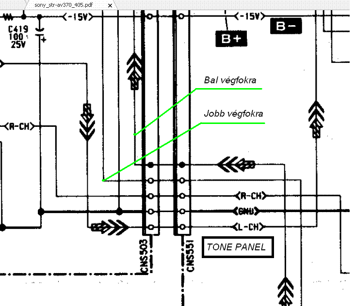 A végfok jó mindkét csatorna,valahol a hangszínt szabályzóban lesz hiba.Még annyit vettem észre hogy van két kondi a végfoknál C601 és C651 az utóbbi értéke változik hangerő változtatásával a másik nem ez lesz a rossz oldal.Hangerő potméter csinálhat ilyet?