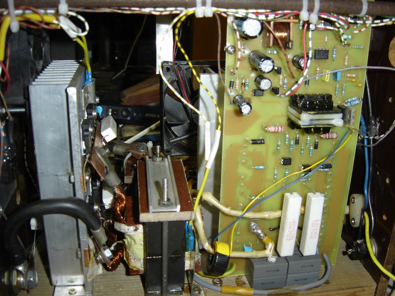 Megvoltak az első próbák, szépen dolgozik. A kimeneten üresjáratban 51V van. A segédtáp fixen 12V, nem ingadozik. Egészen halk, talán egy ici picit a főtrafó sziszeg. Hegesztéskor a főpanel hűtőborda melegszik legjobban, aztán a főtrafó, az egyenirányító bordája szinte hideg. A hűtésen még variálnom kell, de már így is használható