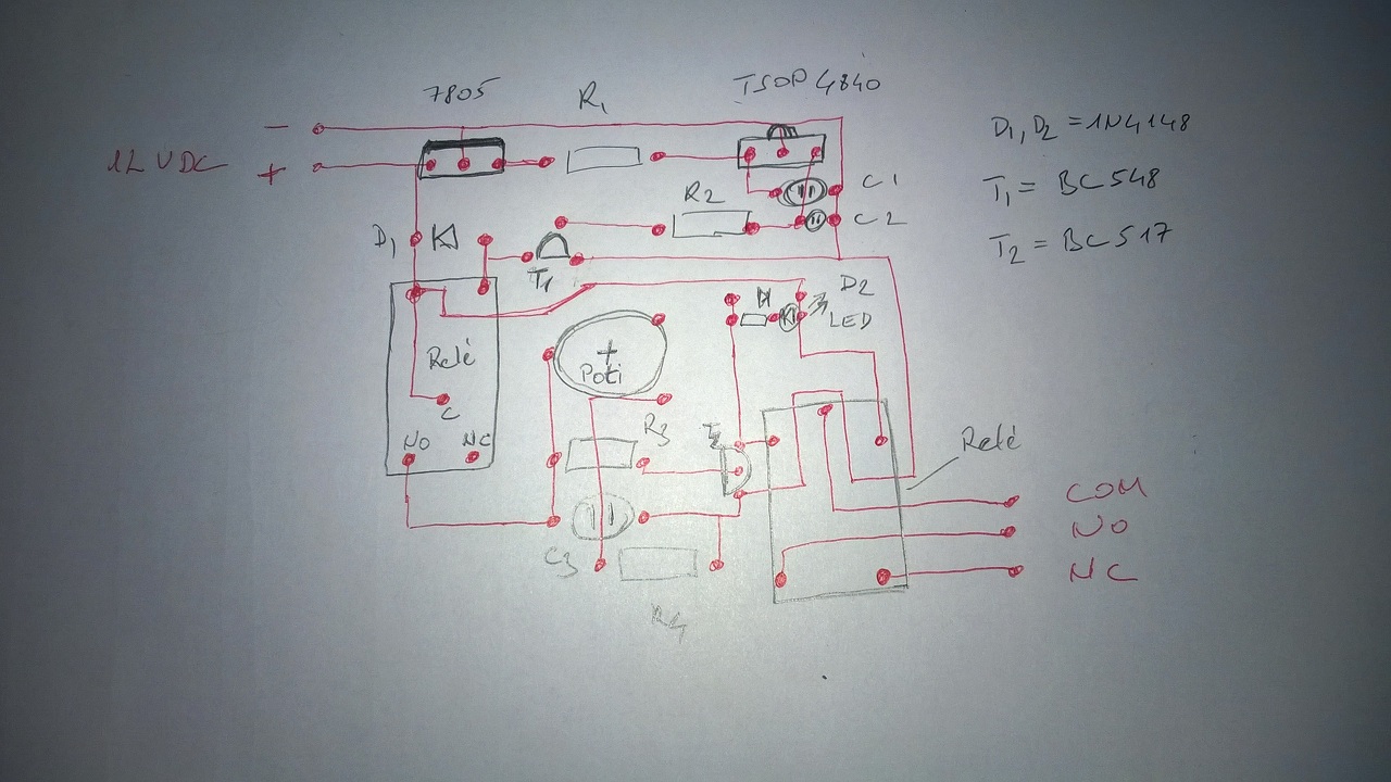 Ha gyorsan a végére akar jutni, leggyorsabb ha valaki mással rajzoltatja vissza, vagy teljesen szétszedi, és egy másik panelen újra építi. A legnehezebben észrevehető hiba, amit mi követünk el, és a keresésnél megszületik az első téves kiindulópont, ehhez az ember ragaszkodni szokott.Kezd azzal a két panel tápját összekötöd (csak azt) mi történik? Ez után mindkét panel még működik? Következő a nyomógomb két végét helyettesíted a jelfogó érintőjével.( jut eszembe a elfogó jól van bekötve???? , nincs benne semmi meglepetés? ) (két panel között 4 vezeték) Ekkor is működik? Már csak az érintő egyik felének a tápra kötése marad, ami után már egy vezeték elhagyható.Ha a stab IC-t is kipusztítja, akkor a tápokkal/stab ic bekötéssel is van némi gond.(kimenete megkapja a 12V-ot) mindenhova az előírt félvezetőt tettél, nem cserélted össze az emitter kollektort ? (tudom azt írtad külön működnek, de az ördög nem alszik)