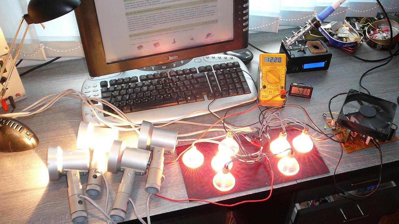 Néhány PC táp SG6105-öt használ, meg lehetne próbálni azon az elven rövidzár-védelmet csinálni. Ahogy olvasgatom a hozzászólásokat, nekem is megjött a kedvem egy 40 Amperes tápot készíteni. Abból indultam ki, hogy a PC táp trafójában az 5 Voltos tekercs háromszorosan van tekerve, vagyis óriási áramokat bír ki. A két szélső kivezetést rákötöttem egy Graetzre és terhelés nélkül több, mint mint 18 Voltot adott le. 3 db nagy duppla Schottkyból csináltam egy Graetz egyenirányítást. 1 db MBR4045 volt egyedül, két S30D40 pedig párban, rátettem egy 2200 µF-os low ESR kondit, aztán összeszedtem a ház összes halogén lámpáját (a konyhából is, párom nagy örömére ). SG6105 van a tápban, túlfeszre szépen lekapcsol, de érdekes módon alacsony fesznél le lehet menni akár 0-ig, mégsem kapcsol ki. Ezt nem értem, miért.A rövidzár védelem az OPP lábon keresztül működik (Over Power Protection). Nem teljesen értem az elvét. Csak annyit tudok, hogy működik, mert ahogy fokozatosan növeltem a terhelést mindig lekapcsolt, meg kellett változtatnom az ellenállás osztást, aztán működött szépen. A rövidzárat nem próbáltam ki, nehogy mégis felszálljon a füst.Végül 4 db 50 Wattos és 7 db 35 Wattos lámpát tettem rá, ami kb 440 Watt, vagyis 37 Amper. A rátett ventillátorral a diódák hőfoka nem ment 65 fok fölé. A 30 Amperes Schottkyk is vígan bírták, ha jól tudom, váltófeszen 150 Amperig jók. Mindenesetre ment.