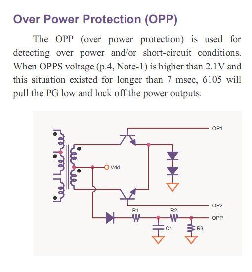 Kösz a válaszod, ez az én nagy problémám is. Tehát, ha az OPP (4) lábon 2,4 Voltra nő a feszültség, akkor 7 msec múlva lekapcsol a gép. Ez túlterhelés esetén hasznos. Ha a fesz 3,2 Voltra nő, akkor azonnal lekapcsol. Nagy túlterhelés, vagy rövidzár esetén van ez. Eddig tiszta.