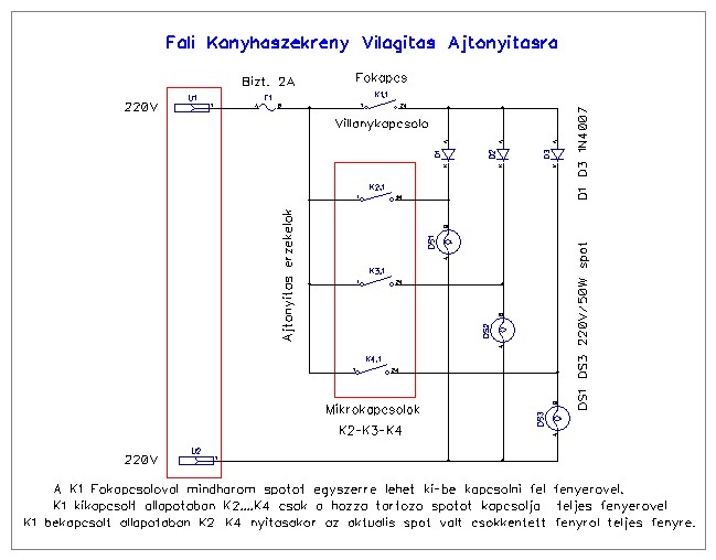 Adott egy konyhaszekrénysor a falon (3 ajtóval), fölső világítással: 230V/50W-os szpotokkal(3db). Mivel a szpotok úgy lettek elhelyezve, megvilágítják a polc tartalmát(is), ha be vannak kapcsolva. Ha csak egy főkapcsolót használnánk, akkor mindíg világítania kellene az összes szpotnak(150W). Ez nem a leg energiatakarékosabb módszer. Így jött az ötlet, hogy mi lenne ha egy szekrényajtó nyitása (is) kapcsolná a hozzá tartozó világítótestet, de a többit nem. Ezenkívül szükség lenne egy "Főkapcsoló"-ra is, ha kell az összes világítás működjön egyszerre, ajtó nyitás nélkül (munkaasztalon tevékenykedés). Így hát, ketté kellene osztani a kapcsolást: 1: a "Főkapcsoló" diódákon keresztül táplálja az izzókat, fél fényerővel(75W/össz) 2: a mikrokapcsolók diódák nélkül táplálják az izzókat, teljes fényerővel(50W/db) Ha be van kapcsolva a "Főkapcsoló" és közben nyitjuk a szekrény ajtót, akkor az épp aktuális szpot fél fényerőről teljes fényerőre vált. Egyszerű megoldásban gondolkoztam, (mikrokapcsolók, diódák) így hát papírra vetettem gondolataimat.(természetesen 230V az a 220V) Még nem próbáltam ki, de elvileg működőképesnek kellene lennie.