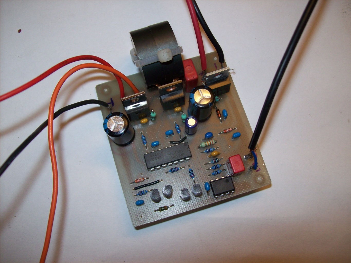 Elkészült az egyik csatorna. A kimeneti tekercs 25x16mm-es AL250-es fazékmagra készült. 1mm-es légréssel. A huzal 8x0,36mm CuZ öszesodorva. Csak +-28 voltról tudtam éleszteni egyenlőre. 25mA volt a nyugalmi áram. 8 ohm műterhelésen 16V jött ki amikor még szép volt a jelalak. Ez 32W-nak felel meg. A tekercs hideg volt a Fet-ek éppen hogy langyosak voltak hűtőborda nélkül Majd a Skori féle önrezgő lesz a tápja +-36V-os. 50W kimenő teljesítményt szeretnék 8 ohmon. A táp már készen van de nincs itthon.