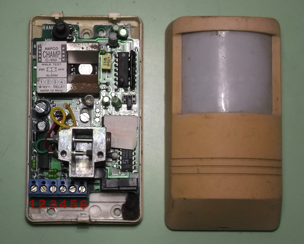 A relé elképzelhető, hogy NC érintkező, vagyis alapból zárva van és szakít, amikor működik. Valamint lehet sorban egy pár ohmos ellenállás a kivezetésekkel... A PIR a passzív infra érzékelő, a felső részen, az MW a mikrohullámú része, alul van az érzékelő. Az ALARM riasztást jelent. Egyébként teszteléshez van, hogy külön be tudd lőni az érzékelőket... Esetleg keress már rá a neten, rajta van, ez egy Napco Champ C-100-as érzékelő...