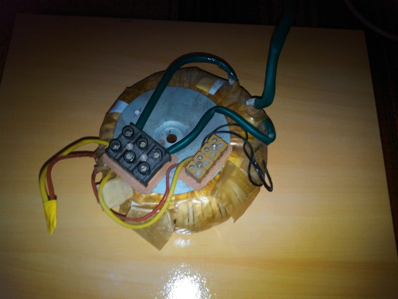 Van egy kis toroid trafom az 1980-as evekbol. Harom kimeneti feszultsege van. Uresjaratban 11.2V, 22V 10.8V-ot ad. (Kek-11.2, Barna10.8.) Fulhallgato erositonek szeretnek szimmetrikus tapegyseget kesziteni belole, csak nem tudom, hogy megfelelne-e. A ket tekercs ellenallasa sem egyforma. A kepeken felitarozva van. A megjelolt kivezetesek egyike egy 3A-es diodahid ele, masik egy 1A-es diodahid ele volt kotve egy tapegysegben.