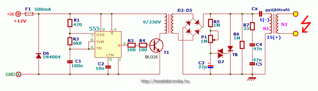 Válaszd a mellékeltet a következő kikötésekkel: R1=530-560 ohm,R2=2,2k,T1=E13007,kis trafó=230V/9V/4W,P1+R5=1,8M,C4-C5=összesen 1 darab 22nF/630V,TR=BT151/800,Cx=16µF/450V (motor üzemi kondi),C3=22µF/63V,gyújtótrafó=Zsiguli gy.trafó,szikraköz=10-12mm (ezt mindenképp építsd be még bekapcsolás előtt,különben oda húz át ahol a legközelebb talál testet!!!). Az 555 időzítőjéhez ne építs be semmilyen diódát se,sehova se!Mutatom a kis trafó képét is,ez ugyan 230V/12V/4,3W -os,de ez megfelelő.Cx kondenzátoron legalább 400-450V kell lenni,mutatós egyenfeszültség mérővel mérjed,ha nincs meg akkor a kis trafó szekunderén kell módosítani.Az áramfelvétel csúcsa a kapcsolásnak nincs egészen 300mA,olyan 200-300mA közötti,ha jól emlékszem.Amikor rákötöd a karámot és bekapcsolod,a belső szikraköznek nem szabad működnie,ha mégis áthúzna,akkor nem terhel be eléggé a karám kerítés,ilyenkor a karám vezeték végére kell tenni egy szikraközt olyan 4mm hézaggal,még éppen áthúzzon,hogy ott távozzon a "felesleges" energia.Kis ellenállású vezetékkel és kiválóan kivitelezett kerítéssel még 1000m hosszon is lehet térdrogyasztó!