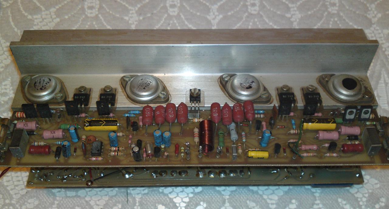 A nálam lévő 800-as a mellékelt kép szerint néz ki. Ez megint egy másik változat. Mint írtam is, mind a nyolc végtranzisztor egyforma (KD503). Nézd meg mi kapcsolódik a táphoz! Abból rá lehet jönni, hogy N-es, vagy P-s a végtranzisztor anélkül, hogy visszarajzolnád a teljes kapcsolást.