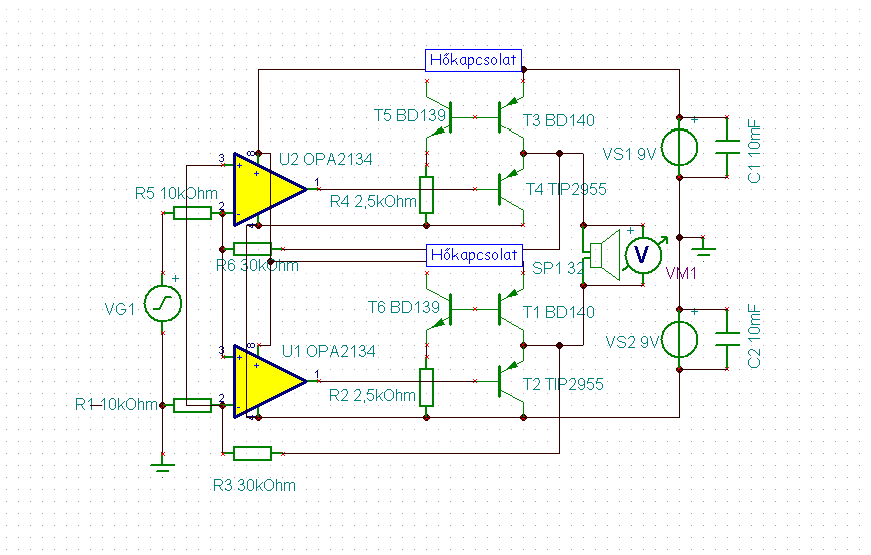 Megterveztem Tina-ban a HIGHAND féle fejhallgató erősítőt, A osztályban. Egy kicsit furcsa hogy akkor érzi jól magát, ha 350-400mA-t adok neki. Legalább is Tina szerint. 32 ohmos a fejhallgatóm. Kiváncsi vagyok mit szóltok az ötlethez. Gondoltam felteszem, hátha van észrevételetek a kapcsolással kapcsolatban.