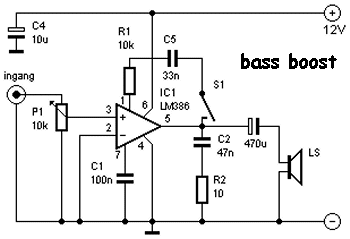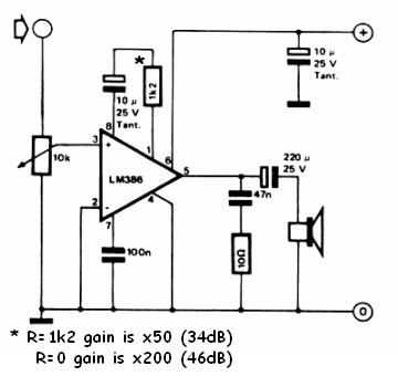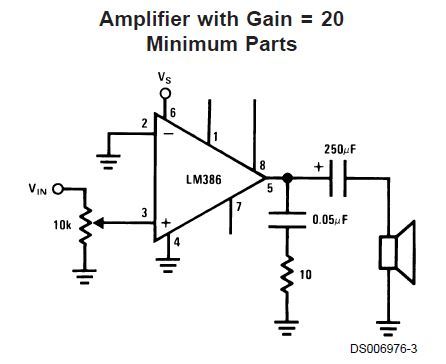 Az LM386 alap kapcsolást egészítsd ki még két ellenállással meg egy kondival.