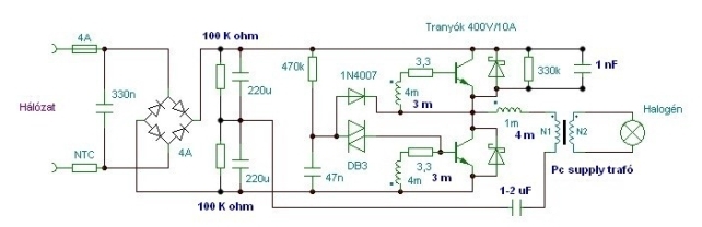 Szeretném megköszönni minden illetékes HE fórumtagnak aki a kapcsolóüzemű tápokkal kapcsolatos kérdéseim megválaszolásában. Az áramkör szekunder oldala nem rövidzár védett ! A CFL ben lévő gyűrőmagot megfelelő fázissordben átekerés nélkül használtam fel. Így ahogy Skori is a dugasztápnál leírta a ferki üresjártaon 20 KHz terhelve 40 Khz körüli.