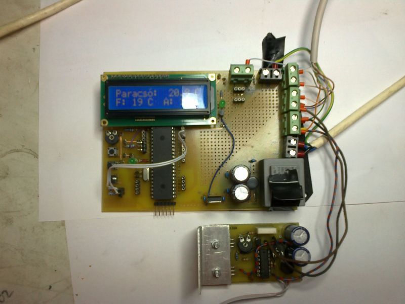 Elkészültem egy PIC16F877A ra épülő különbségi hőmérővel. A felhasználási terület pálinkafőző felügyelete .Jelenleg 3 hőmérőt tartalmaz. 2 db DS1820-at (nem igényel kalibrálást) és egy analóg PT100 at. A két DS1820 a hűtő oldalára van erősítve az egyik az aljára a másik a felső harmadra. A PIC beolvassa a DS1820 rom kódjait és tárolja őket a kommunikációhoz. Az áramkör tanítható több max32 db DS1820 ROM kódjának tárolására. Ez a hőmérő chip egy adatbuszon kommunikál a PIC-el. Hasonló különbségi hőmérő itt a hobbielektronikán Vicsys tollábólVicsys alkotása A programot a barátom írta, s nem az itt közzétett program átdolgozása. A hőmérsékletkülönbség állítható s ha pl 2 fokra van állítva bekapcsolja a szilárdtestrelét s a vízvezetékbe épített mágnesszelepet. Ha a két hőmérséklet kiegyenlítődik akkor pedig kikapcsolja a mágnesszelepet. A felhasználás jelenleg a fentebb említett, de a fantáziátokra bízom, mi mindenre lehet még használni. (Lakásfűtés optimalizálás például) A PT-100 as analóg hőmérő a páracsőre van rögzítve, ez csak információt ad(egyenlőre). A kapcsolási rajz, nyákterv később. A hex?, ...hát ezt privben...