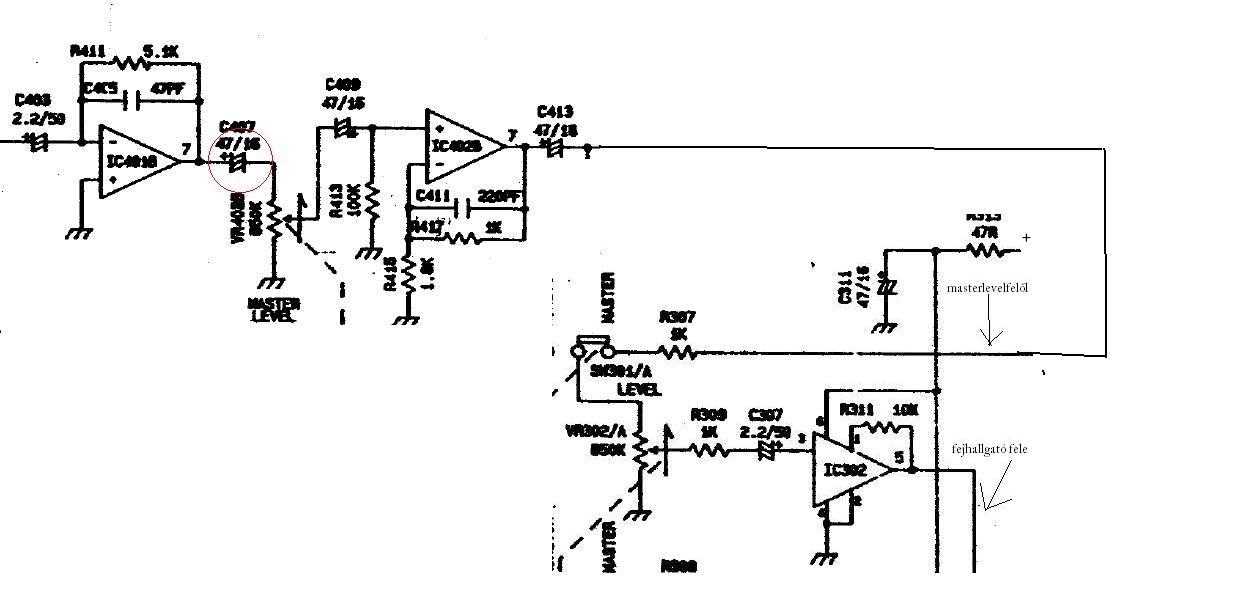 Belefutottam egy dologba elsőre egyszerűnek tűnt, és lehet, hogy az is, csak én kezdem túlpörögni. Csatoltam egy kapcsolást, amit szeretnék megvalósítani, az az, hogy a master level pótméter, előttről levenni jelet, és továbbadni, a jobb alsó fejhallgató erősítő foknak (NE5532) közvetlenül, úgy, hogy ahhoz "jól illeszkedjen". Bekarikáztam pirossal, hogy valahol ott, de nem tudom, hogy a kondenzátor előtt, mögött, ha kihagyom második műveleti erősítőt (JRC4558) kap-e elég jelet az NE5532. Köszönöm, ha ránéztek a dologra