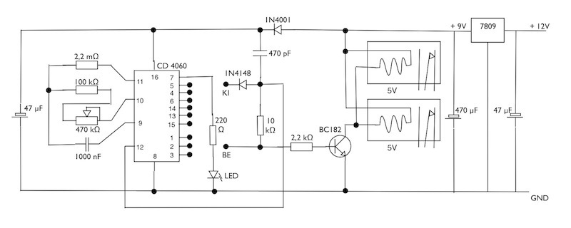 Ezeken az oldalakon olvastam Proli007-től egy 4060-as időzítős áramkört. Hol seregélyek ellen, hol wc lámpa késleltetésre használtátok. Én ezek alapján építettem egy kerti locsolóvezérlő áramkört. A problémám az volt, hogy gyenge a kutam vízhozama. 5 perc szivattyúzás után kell 3/4 óra szünet, hogy újra legyen víz. Szakértő nem vagyok, csak lelkes, ezért kérlek benneteket, véleményezzétek a munkámat. Én megépítettem, kipróbáltam egy hétig, és tökéletesen működik, talán csak "finomhangolni" kellhet (fogyasztás, RC értékek, stb.). A kapcsolásról: A lelke már ismert korábbi fórumozók által. Amiben más egy kicsit, hogy én nem kötöttem a rajzon fixre az időzítéseket. A "BE" pont a relé behúzásának kezdetét, a "KI" az elengedés idejét jelenti. Ezeket ki-ki (nem teljesen) szabadon kötheti az IC 1, 2, 3, 4, 5, 6, 7, 13, 14, 15 lábaihoz a neten fellelhető datasheet alapján. Értelemszerűen a "BE" idő nem lehet hosszabb a "KI" időnél. A trimmert a további finomhangolás miatt tettem be. Az áramkör azért 9V-os, mert a relék 5V-nál nem húztak be. Tettem még az áramkörbe egy biztit is, bizti ami bizti. Az áramkörnek nem kell külön táp. Amíg nem olvasod el a kritikákat, addig ne építsd meg