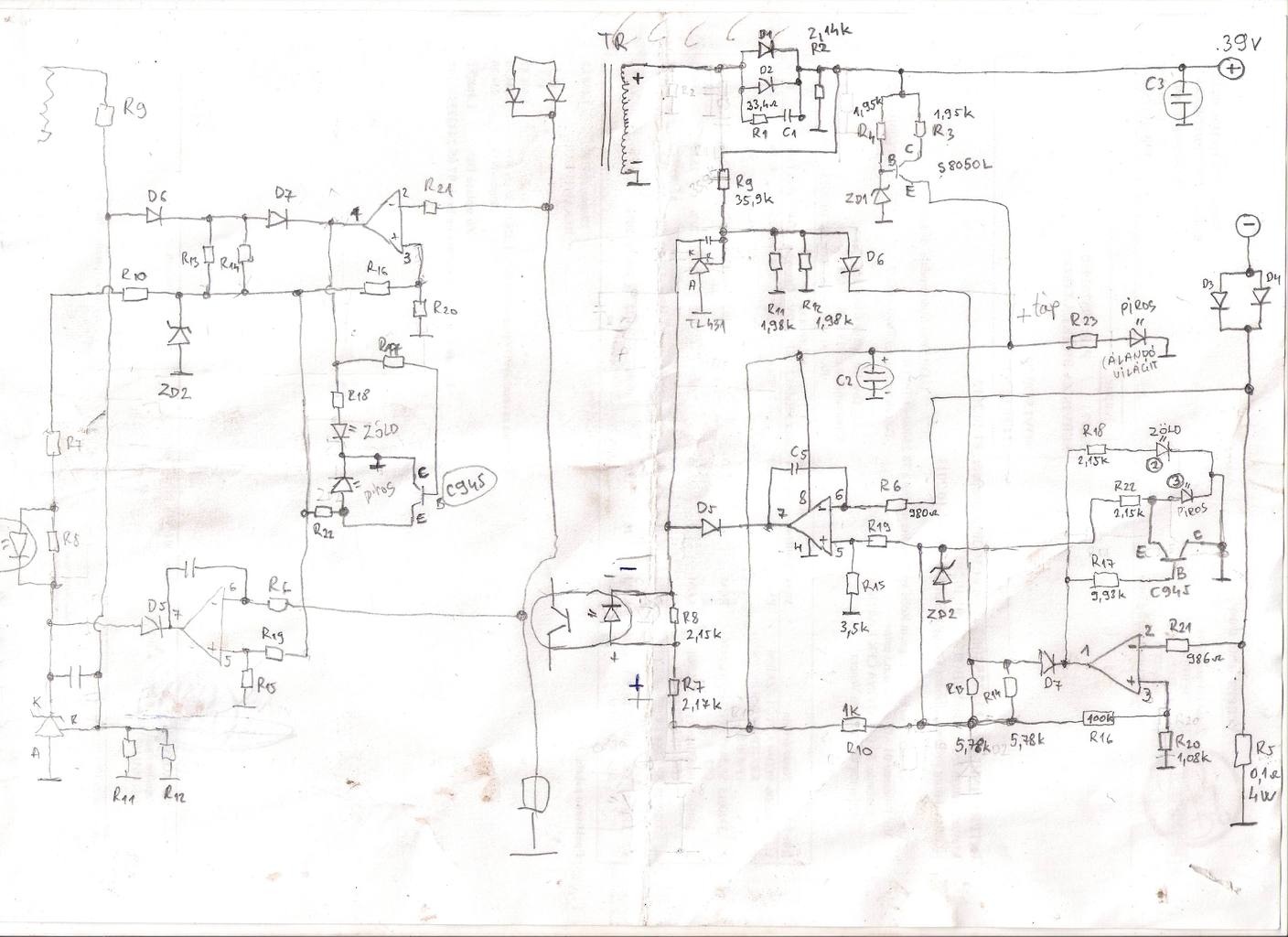 Sziasztok! Van nekem egy elektromos kerékpár töltő.Megpróbáltam elkészíteni a szekunder kapcsolási rajzát. Mellékelem is.A jobb oldali jobban sikerült,a bal oldali nem annyira. Bekapcsoláskor tölt szépen.Feszültség,és áramkorlát meg van.Mikor a töltő áram leesik 0.33 Amperre,akkor az LM358-as komparátor átvált,akkor C 945-ös tranzisztor lezár,elalszik a piros led,és kigyullad a zöld.Ezt így is csinálja,csak a zöld kb.fél másodpercig világít,aztán újra felváltja a piros,és elkezd újra tölteni 0.33 Amperrel kb.fél másodpercig ,majd újra zöld ég ,töltőáram=0 ,aztán megint piros....és így tovább váltogatják egymást.Úgy kellene,hogy amikor lecsökken a töltőáram 0.33 Amperre,akkor átvált zöldre,és leáll a töltés. Tudnátok-e választ adni hogy miért kapcsol újra és újra töltésre?