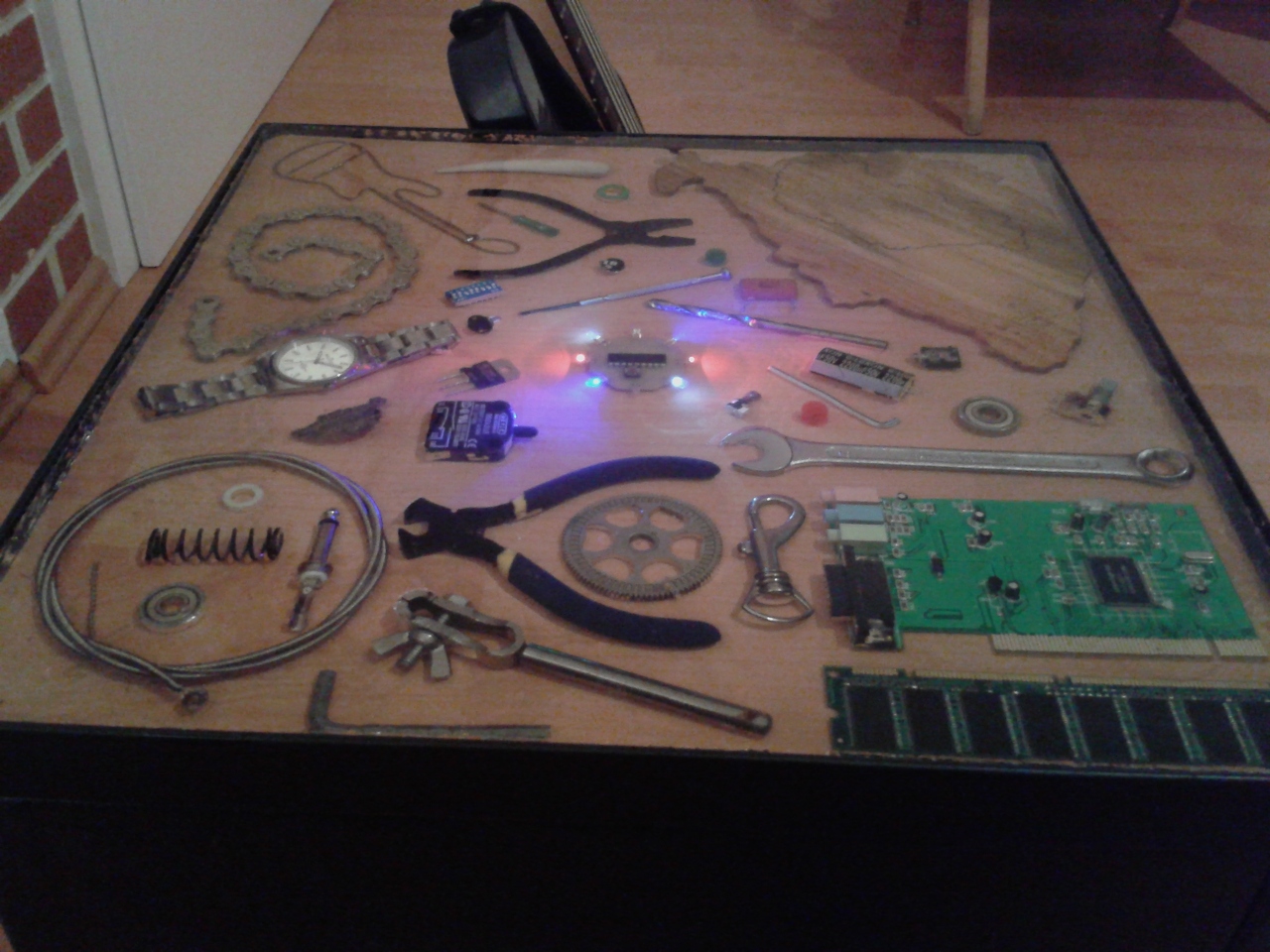 Kis szobával rendelkezőknek ajánlanám figyelmébe ezt a kis asztalt. Olyan tárgyakat használtam fel a "díszítésre", amiket kidobni nem akartam, viszont a helyet foglalták. Az alapmérete 40x40 cm, magassága 45 cm. A felső keretet 30-as szögvasból készítettem, az oldalai bútorlapok, amiket bevontam műbőr hatású szövettel. A vas keret aljába nekem a parkettából maradt anyag került. Erre tettem rá a különféle eszközöket, szerszámokat, dísztárgyakat. A kisebbeket leragasztottam. Utolsó lépésként az egészet kiöntöttem víztiszta polisztirol gyantával. Külön érdekessége, hogy a középen levő kis szerkezet működésre bírható, és mivel víztiszta tokozású LED-ekkel szereltem, aminek a fénytörése közel megegyezik a használt műgyantáéval, így csak a LED-ek anódja és katódja látszik, a tokozás nem. Ez már csak a működés szempontjából is fontos, hiszen így olyan, mintha tényleg a műgyanta világítana. A basszusgitár csak a méretek szemléltetésére szolgál. Néhol homályos, mert a húrt nem pucoltam meg előtte, és a gyanta lemosta a ujjról ottmaradt szennyeződéseket, valamint a gyanta zsugorodási hajlama miatt a kerettől néhol elvált. Ennek ellenére szerintem mutatós és érdekes látványt nyújt.