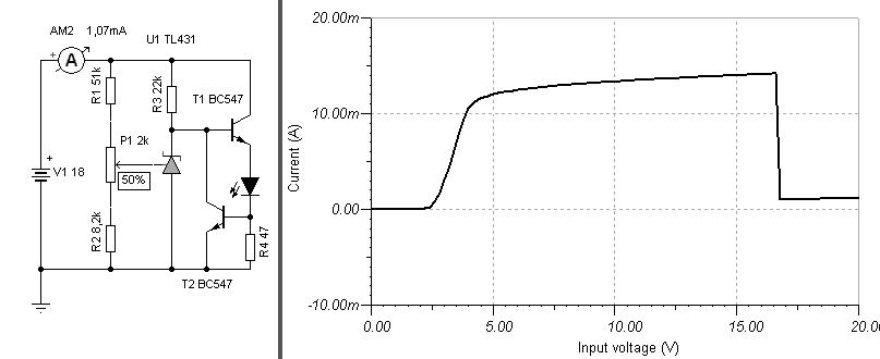 Hello! Lemerülés jelzésére egy ajánlat. A Led árama kb. 12mA Ha az aksi a küszöbfeszültség alatt van, ha felette kb.1mA. Jelenleg a potival 15..18V között állítható, de R1 és R2 ellenállások változtatásával a kívánt tartományra állítható be. De a poti akár el is hagy ható, ha az ellenállás egyik tagját két ellenállásból állítjuk össze így az jusztírozható. üdv!
