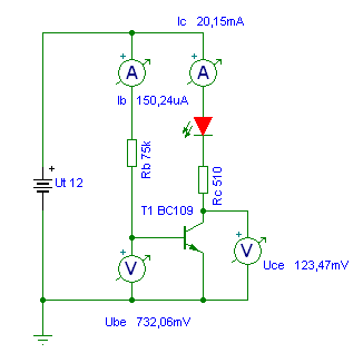 - A 100mA a tranyó maximális kollektorárama, de egy mezei Led-nek inkább 20mA dukál. - Az adatlap azt mondja, hogy 2mA mellett a béta (Hfe) 420 körül van. 20mA-nél ez kevesebb lesz, de legyen az egyszerűség kedvéért 400. Ib=Ic/béta=20mA/400=50uA Ez lesz a minimum bázisáram. - A tápfesz 12V. A tranyó bázis-emitter nyitófeszültsége kb. 600..650mV. Ezt le kell vonni a tápból, mert annyi jut a bázisellenállásra. URb=Ut-Ube=12V-0,6V=11,4V. A bázisellenálláson akkora áramnak kel folyni, mint ami a bázisba szükséges. Vagy is Rb=URb/Ib=11,4V/50uA=228kohm. - De mint mondtam, a minimális bázisáram helyett számoljunk 2..3-szor nagyobb értékkel. Legyen Ib=150uA. Ehhez tartozó ellenállás, Rb=11,4V/150uA=76kohm. Ehhez legközelebbi szabványos érték, a 75k. De ha 51k vagy 47k értéket választunk, azzal sem tévedünk, mert növeljük a szükséges bázisáram értékét. - Akkor már számoljuk ki, a Led ellenállását, vagy is a kollektor ellenállást is. Ha a Led piros, annak nyitófeszültsége kb. 1,5V. Ezt le kell vonni a tápból, és megkapjuk a kollektor ellenállásra jutó feszültséget. (A tranyó maradék kollektor-emitter feszültségét elhanyagoljuk.) URc=Ut-Uled=12V-1,5V=10,5V. Tudjuk hogy 20mA lenne a Led árama, így Rc=URc/Ic=10,5V/20mA=525ohm. Ha 510ohm-ot választunk, nagyot megint nem tévedünk. - Nos ennyi a kapcsolás. A kollektorban az 510ohm, és a Led. A bázisban meg a 75k a táp és a bázis között. Ha a tranyónk bétája nem vacak, folyni fog a 20mA áram. De le is szimuláljuk.. LÁtható, hogy a tranyó úgy kinyitott, hogy a maradék kollektor-emitter feszültsége 123mV. A bázis-emitter meg kicsit több, a számítottnál. üdv!
