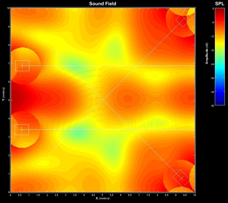 A sarokratolás 9dB emelést eredményez, a reflexiók a terem bizonyos pontjain kioltást, bizonyos pontokon erősödést eredményeznek.