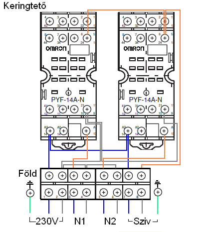 - Általában mindenhol jelölve van L-fázis-fekete. N-nulla-kék. F-földellés-zöld/sárga - A betáp 230V érkezik valahonnan. Kék a nulla, Fekete a fázis, zöld-sárga a védőföld. A zőld/sárgát a reléket tartó fém alaplemez földelő csavarjára kötöd. (Ez lesz egyben a szerelőpanel földelése is.) - Az N1-N2 termosztát felé menő kábel két erét a Q11 és A14-re kötöd a termosztátnál. (Q11-fekete, Q14-kék) - A szivattyú három kék-fekete-zöld/sárga vezetékét értelem szerűen a szivattyúra kötöd. üdv! proli007 A hozzászólás módosítva: Okt 22, 2012