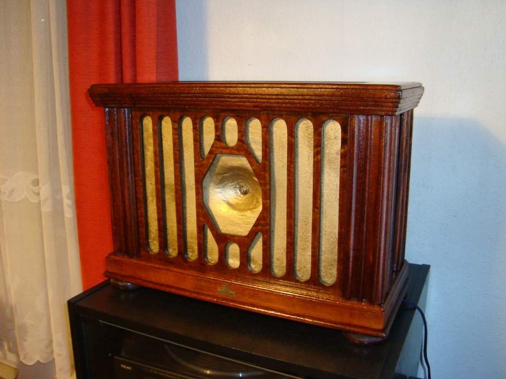 Üdv mindenkinek. Még máj. 5-én írtam erről a lengőnyelves selyemmembrános hangszóróról, most jutottam oda, hogy be van fejezve, fel van újítva. Kalandos egy dolog volt, akkor panaszkodtam rá, hogy ritka ronda hangja volt, és valójában azért nem haladtam vele, mert csak szobadíszt nem akartam csinálni belőle. Mivel a lengő nyelv közvetítőcsapjai, csavarjai hiányoztak, valójában azt sem tudtam, hogy hogyan működött eredetileg. Hosszas kísérletezés után jöttem rá az eredetí működésre, vagyis arra, hogy a lengőnyelv valójában nem csak a selyemmembránt, hanem a hátsó hajlított dobszerű furnírlapot is kell hogy rezgesse, össze kell hogy kötve legyen vele, és ott lehet állítani a légrést is, ami egy ilyen hangszórónál alapvető követelmény. A dobozt teljesen szét kellett szedni, darabonként lecsiszolni, és összerakva újralakkozni. Mivel nagyon tagolt volt az alakja jó sok meló volt vele, vagy egy hétig csak csiszoltam. Szóval most kész, viszonylag elfogadható torzításmentes hangja van, állítom, hogy szebben szól egy néprádiónál. Időközben hozzájutottam egy eredeti 20-as évek béli ládarádióhoz, majd írok arról is, és a kettőröl együtt csinálok videót, hogy bemutassam hanggal együtt.