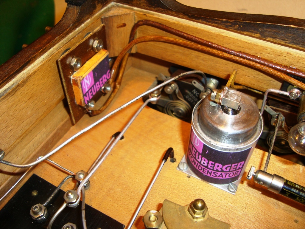 A készülékben minden eredeti, és a több mint 80 éves masina úgy néz ki, mint ha most jött volna ki a gyárból. Nincs benne egyetlen forrasztás sem, minden csavarokkal van rögzítve mindenhez. Erre valóban rá lehet mondani, hogy még úgy van "építve".Természetesen rögtön nekiálltam az átalakításnak, nagyon vigyázva hogy ne látszon semmi. Az elkókba új belsőrész került, a hálózat becsatlakozásához csináltam egy kis dobozt, benne egy Gretz egyenirányítóval. Persze másoltam a már meglevő címkékből, és így arra is került felirat. Ezután ráment vagy egy nap a szükséges feszültségek gondos beállítására, a gépben ugyanis nincs hál. trafó, így minden feszt soros ellenállásokkal kell belőni. Szerencsére a lényeges helyeken állítható ellenállások vannak. Nagyon szépen szól az Orion selyemmembránossal, az este vagy 8-10 külföldi adót is fogtam a hazaiak mellett, elég nagy hangerővel, persze komoly kinti antennával, meg földeléssel. Hullámot úgy lehet váltani vele, hogy ki kell cserélni a tekercseket. Kell még csinálnom hozzá egy leválasztó trafót, mert nincs benne elválasztás minden eleme kapcsolatban van a hálózattal, és ha nem a műhelyasztalból használom nem szeretném hogy megvágjon valakit. A többi a képeken.