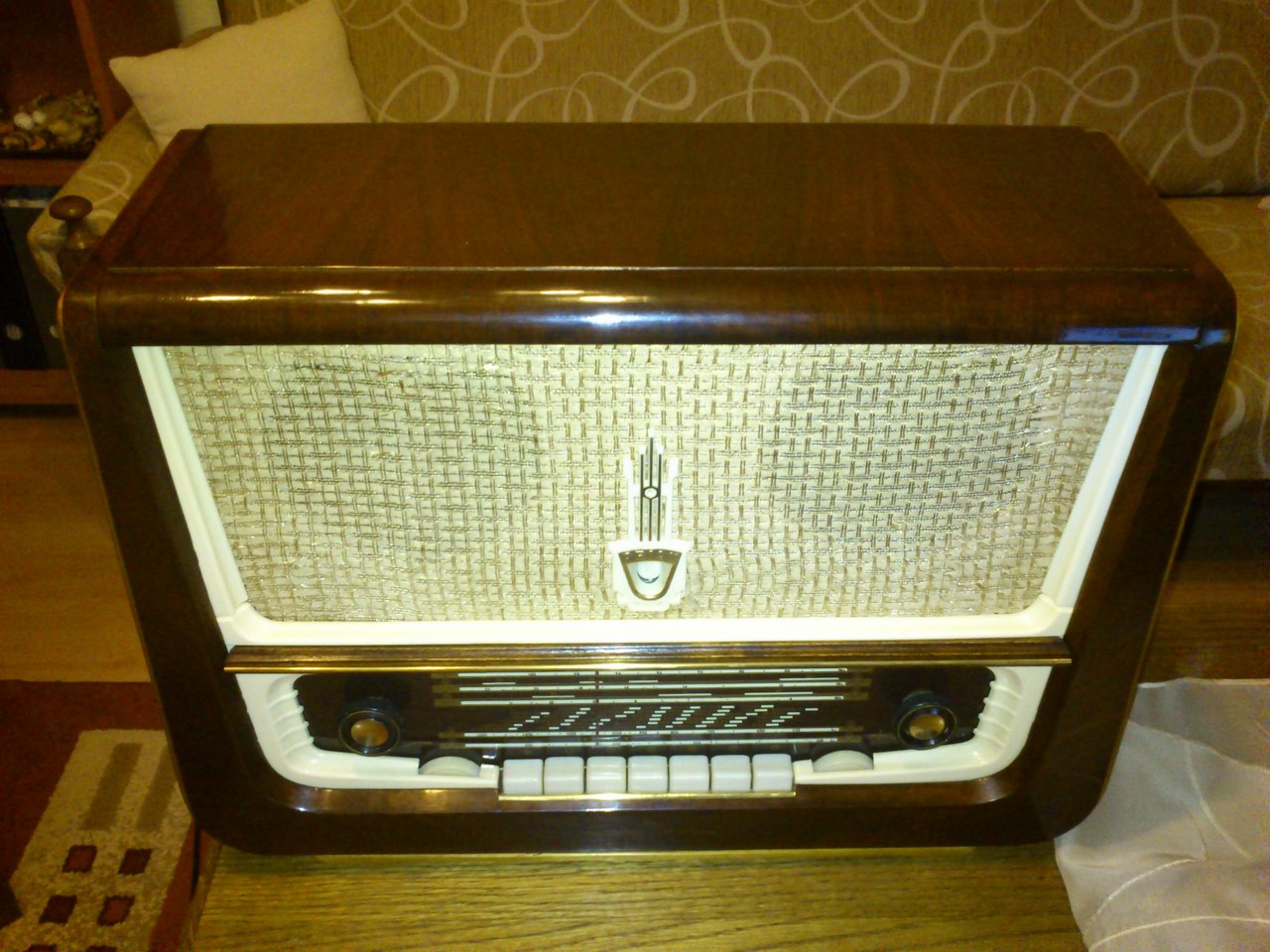 Üdv mindenkinek. Szinte napra 2 éve mutattam be ezt a német ládarádiót. Akkor csak azért hozta a tulaja, hogy szólaltassam meg, látni akarja működik-e. Nehéz ügy volt, mivel a gép 220V egyenfeszről működik, (volt ilyen Németországban) és lengőnyelves hangszóró kell hozzá. Már akkor szerettem volna elbarterolni, vagy megvenni, de nem adták. Most aztán kissé kalandos úton ugyan de mégis csak hozzám került, már az enyém. Az volt valószínű a baj, hogy senki nem tudta a fentiek miatt szóra bírni, így aztán csak szobadíszként szolgált, meg el lehetett talán mondani, hogy szól ugyan, de csak akkor ha, stb.