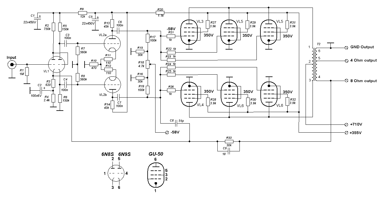 Lényegében síma Willyamson meghajtás, meg 3-3 párhuzamos végcső... Lehetséges, hogy elég sokat kell sportolni, mire összehozol egy (vagy két?) hatosfogatot ezekből a végcsövekből... De a kimenőteljesítmény biztosan elegendő lesz... Tápot sem kis kihívás egy ilyen amphoz tervezni/építeni