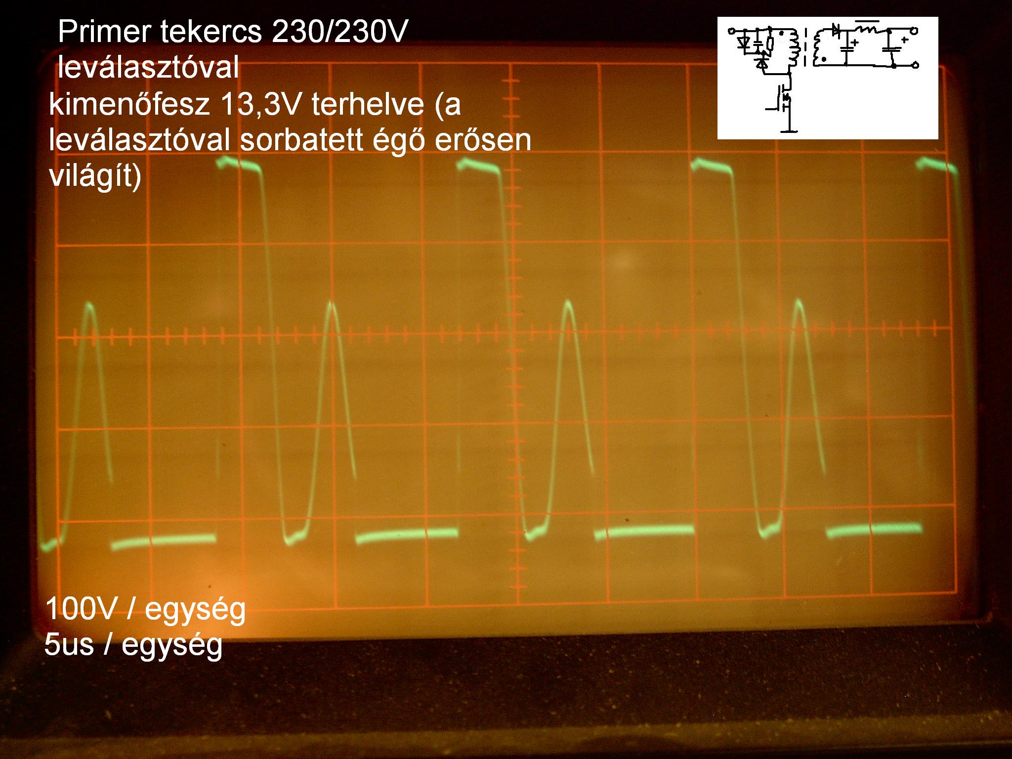 A szkópkábel földje a primer felső felére a meleg pontja meg a pimer alsó felére. Mivel itt folyamatosan méregetek utána észrevettem hogy a Primer oldali táp csak 190V az égő miatt. Ezértis alacsonyak a jelamplitúdók. Csak eddig nemmertem kivenni az égőt nehogy vajlegyen.