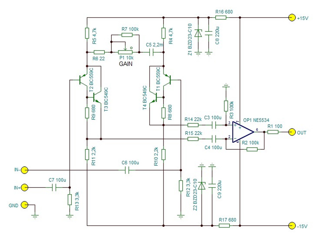 Erről van szó. Nagyon szépen köszönöm szépen tervezem is meg a panelt. Kérdésem annyi lenne, hogy a 100 ohm az kell a kimenetre ha jön még az eq? Másik kérdésem pedig a P1 az a gain potméter lenne?