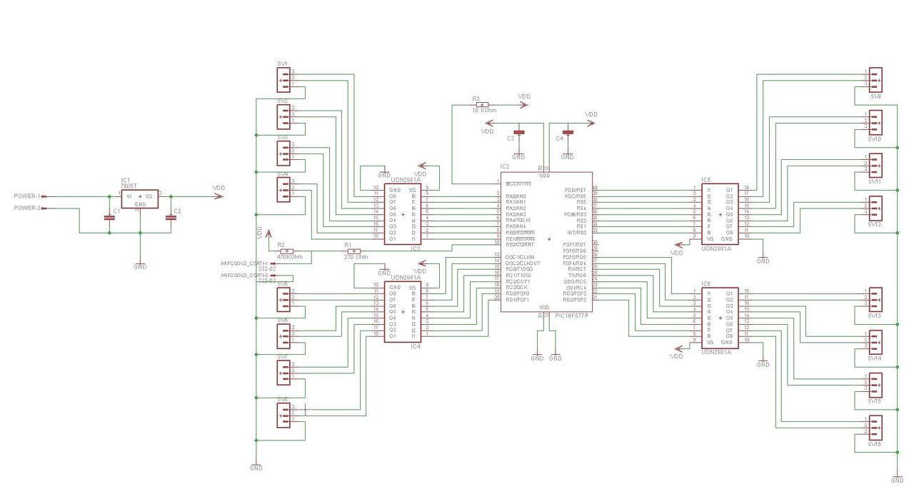 A 4 db 100n ból csak egyet hagyj meg azt viszont tervezd a táplábakhoz a lehető legközelebb,miért terveztél rá 4 et?? A 13-14 es lábra ne tervezz kimenetet oda egy 4 MHz -s kristályt és 2 db 22pf os kondit tegyél , a 16f877 nem működik kristály vagy külső rc tag nélkül nélkül .