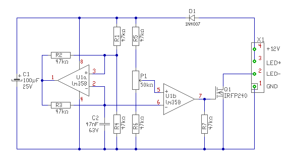Szia Gábor! Megépítettem, szépen működik. Ennél amikor majdnem letekerem az 50K potit elkezd villogni kis fényerőn. Alkatrészben egyedül a 47nF helyett 100nF ot tettem be. A többi stimmel. Illetve a poti ahogy a kezemben van vagy valamelyik részéhez hozzáérek, akkor mászkál a fényerő. Gondolom ez normális és a LED nyítófeszültsége a leszabályzás alsó határa, de valahol ott kezd el villogni. Köszi.