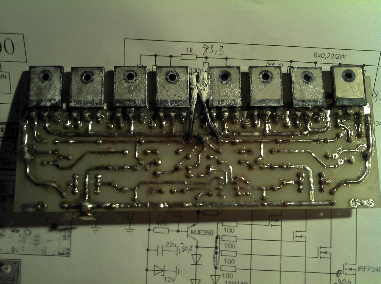 Az a baj, hogy ez az a panel ami jó volt mikor összeraktam. Annyi változott hogy a diódákat forrasztottam át. Viszont ott nem látok semmi problémát... Sajnos mikor leszedted a hűtőbordáról a ragasztott diódákat, akkor a fele dióda rajt maradhatott a ragasztásban. Tehát az eleve cserés lett, mert rossz diódákkal kaptam meg. Ezzel semmi probléma nincs. Ez a felfogatás ezzel jár.A tranyókat a borda kialakítása miatt kellett átfordítgatni. Ettől függetlenül működnie kellene. Kábelezés tutti jó. Gyári tápot használok. Egy halott végfok helyére raktam be a cuccot egy gyári erősítőbe. Bemenete rövidre van zárva , tehát földhurok nem lehet bent. Egy helyen van földelve az egész panel , az is a pufferek közepénél. De várok minden ötletet a probléma ügyében...